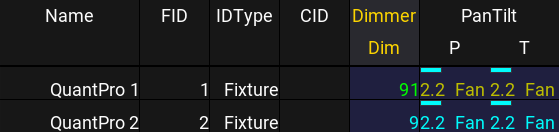 There is a phaser value on the dimmers of these two fixtures. All layers of phaser values share the same purple color. The top value with a purple background comes from the programmer. The bottom value with purple text comes from the current cue in a selected sequence.