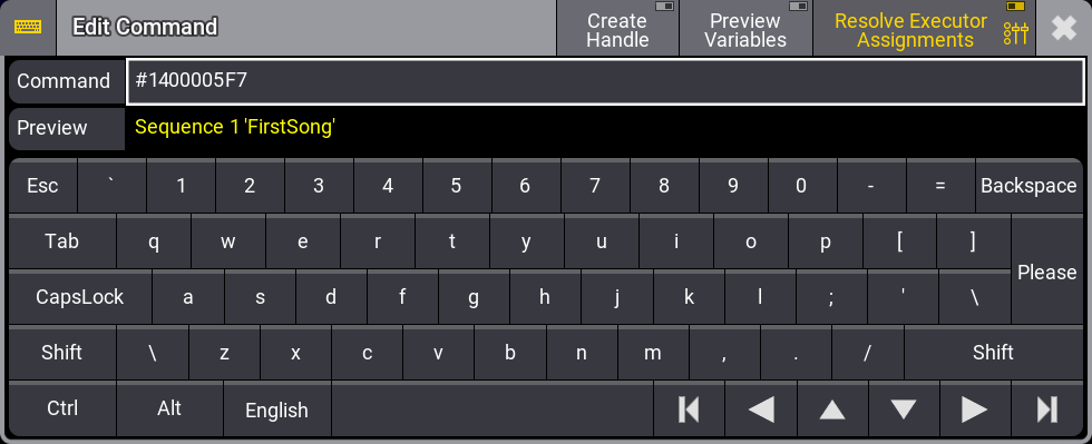 Sequence 1 'FirstSong' is assigned to executor 1.201 in the following example. Pressing that executor when inputting a command when Resolve Executor Assignments is enabled, the handle of the object assigned to the pressed executor is entered in the command. The preview displays the object type, number, and name in yellow.