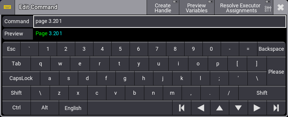 Sequence 1 'FirstSong' is assigned to executor 3.201 in the following example. If Resolve Executor Assignments is disabled, pressing executor 3.201 when inputting a command enters Page 3.201 in the command: