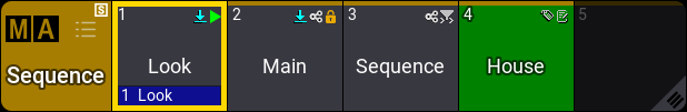 Each sequence pool object shows up to three cues. If there is an active cue, it is in the center with a blue background. If there are no active cues, the center cue is the first cue in the sequence.