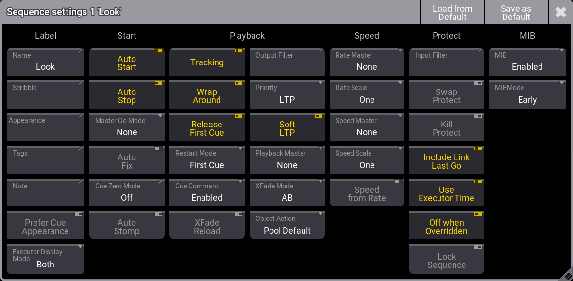 The title bar has two relevant buttons. The left one is Load from Default. Tapping this loads the stored sequence defaults. Next to this is Save as Default. Tapping this stores the current settings as the new default.