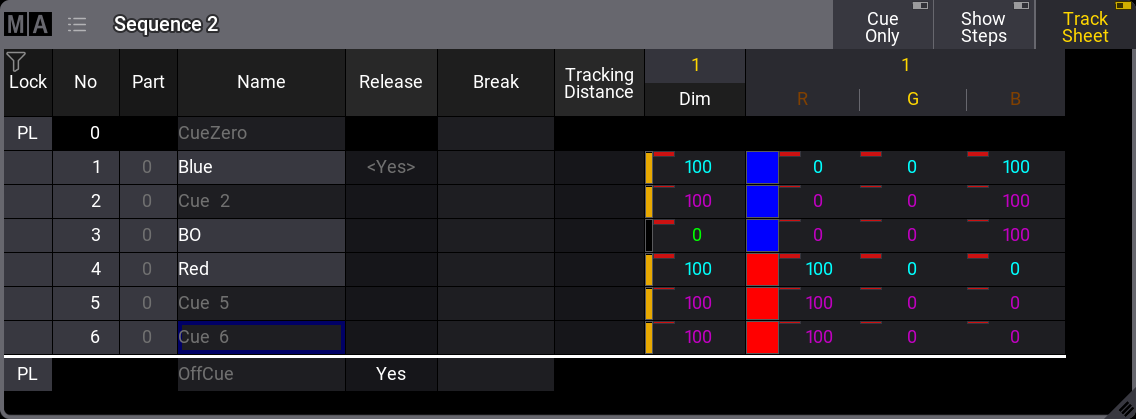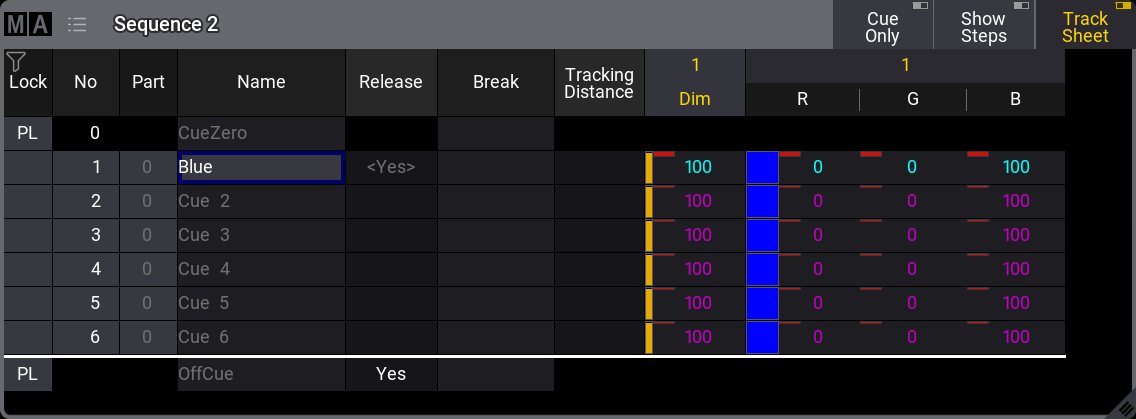 Notice the difference in text color between the values in cue 1 and the others. The magenta text color indicates that the value is not stored in the cues but is a tracked value from a previous cue.