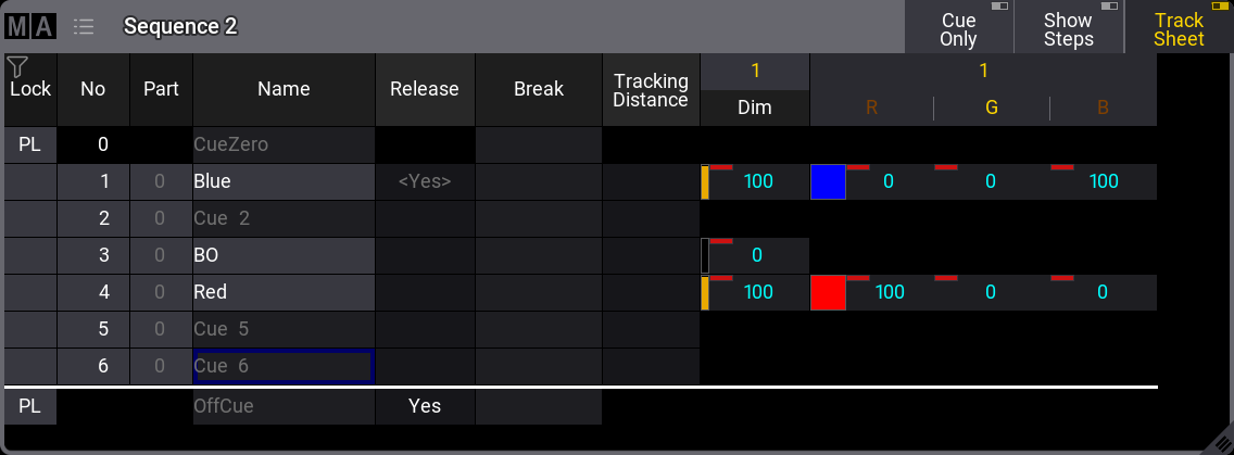 The text color of the dimmer value is now white in cues 4 and 5. All the color values are also white in cue 5. This indicates that the values are stored here, but are the same as the tracked value. These are called "Blocked" values. This means that if any value is changed in any previous cue, it would still be 100% in cue number 4. It blocks the tracked value from cue 1 (the same value), and the value stored in cue 5 is tracked to the end.
