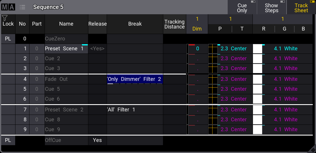 Cue 4 is a fade out. The current dimmer value of 0% can be protected by adding a second break in cue 4, but this time using the "Only Dimmer" filter: