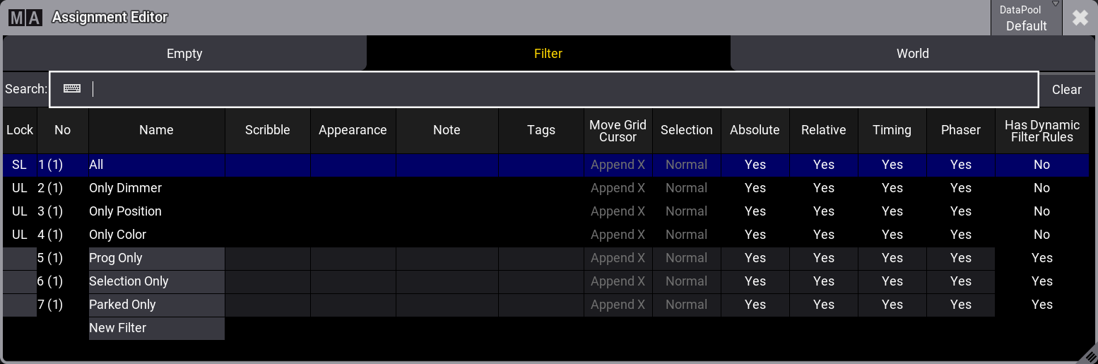 This has three tabs: Empty, Filter, and World.