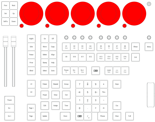The five dual encoders are used to adjust the different attributes of the fixtures. There are four different actions on the encoders: