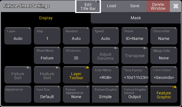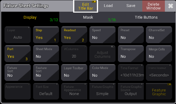 Under the Display tab, tap the buttons you wish to display in the title bar of the Fixture Sheet and toggle to Yes. See Title Bar Configuration for more information.