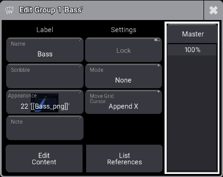 Use the Master fader on the right to control one of the four group master types. Read more in the Group Masters topic.