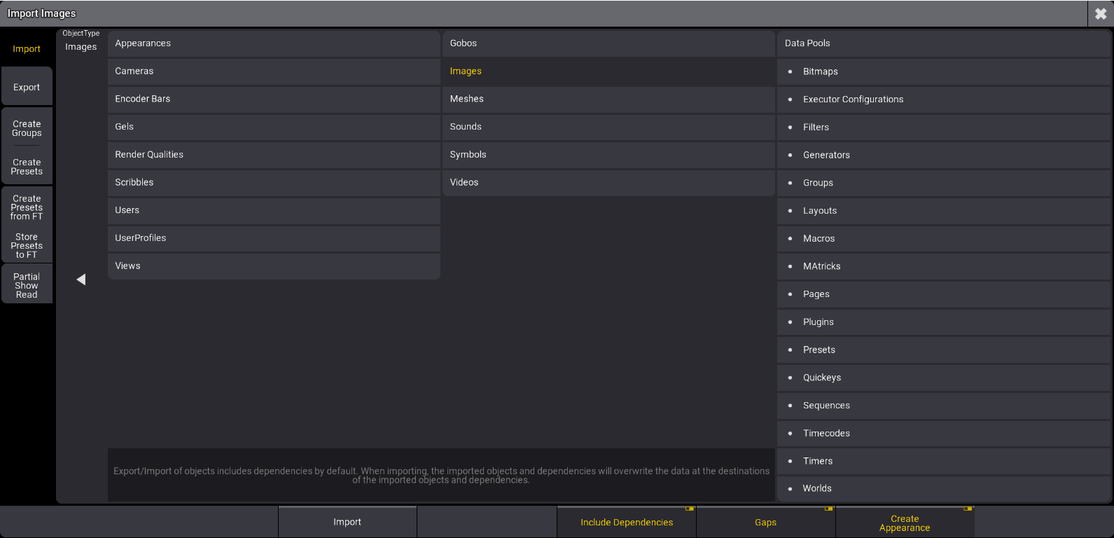 | Certain object types (including Gobos, Images, Symbols, and Videos) can be included in Appearances. To automatically create new Appearances based on these objects as they are importing, toggle the Create Appearances option before tapping Import. |