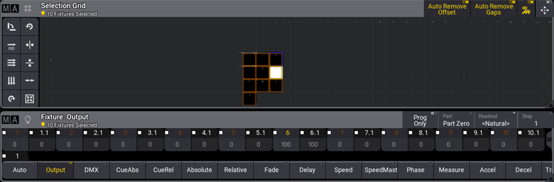 It looks like this in the Selection Grid and Fixture Sheet (Channel SheetMode and Output layer selected) window: