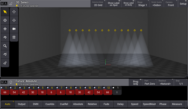 For the following examples, fixtures 1 thru 12 were patched from left to right. For more information, see Patch and Fixtures Setup.