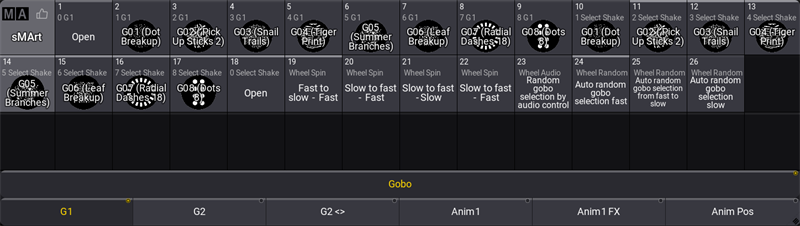 The bottom of the sMArt view shows an attribute selection bar. This makes it easy to select the desired attribute in the currently selected feature group. The example above shows the Gobo feature group, the selected Gobo Wheel 1 (G1) attribute and the attributes G2, G2<>, Anim 1, Anim 1 FX, and Anim Pos.