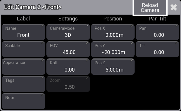 The cameras can have a 3D perspective or a flat 2D projection. Editing this field allows selecting one of the predefined 2D camera angles. Selecting a 2D camera disables some of the other values in this pop-up.