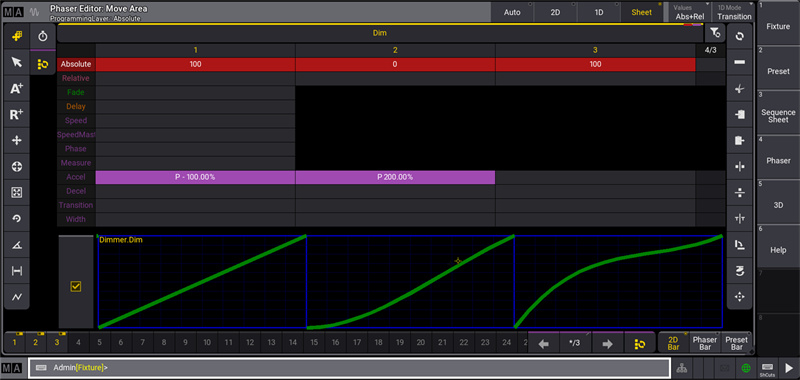 Each phaser step can include attribute value information. These values can be an absolute value (for instance, a dimmer value of 50%) or a relative value (for instance, a dimmer value of -20%). Steps can contain both absolute and relative values simultaneously.