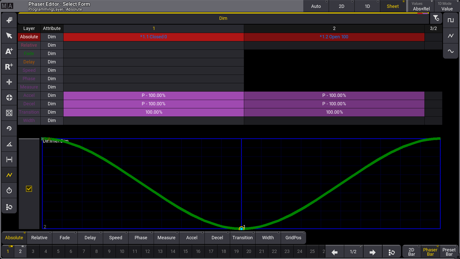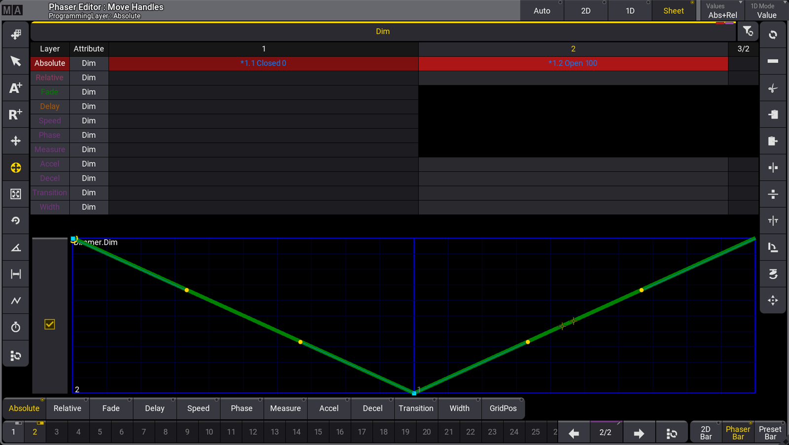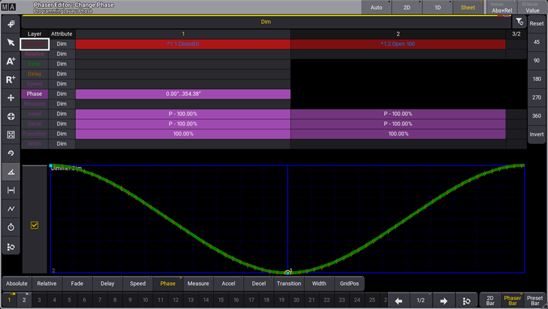 This is the base for the phaser. There are now two steps with a dimmer value of 0 in the first step and a value of 100 in the second step. All the fixtures are changing together from step one to two in a linear direction and do not fade using a sine curve. It looks like this in the Phaser Editor: