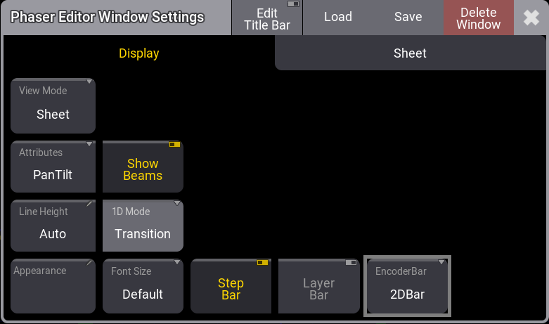 - Attributes - Defines which position attributes are used when creating a position phaser. Tap to toggle between PanTilt, XY, XZ, and YZ.