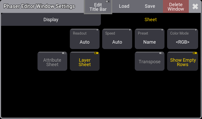 - Attribute Sheet - Tap to show or hide individual rows for each attribute included in the phaser. If Layer Sheet is enabled, each layer will include all of these individual layers.