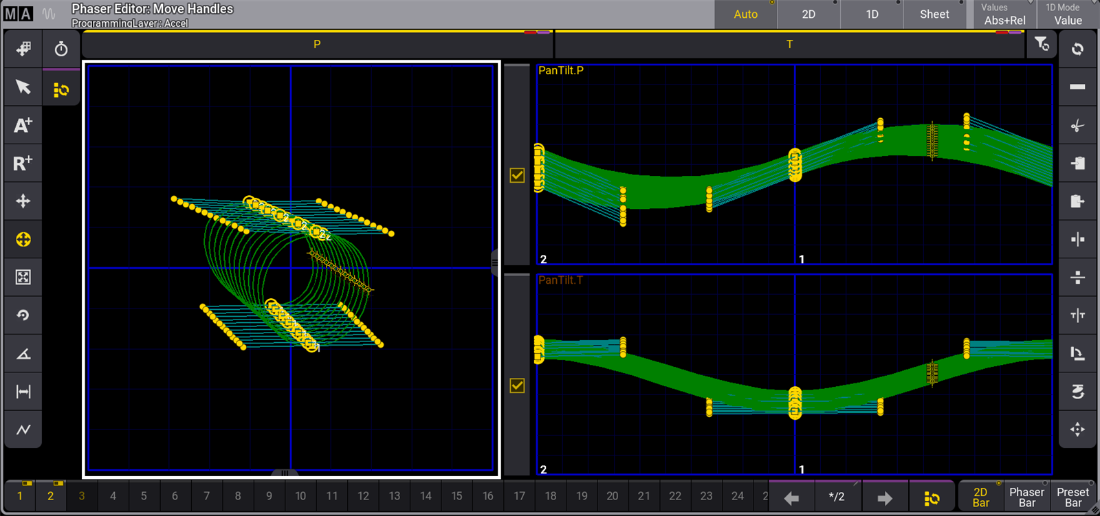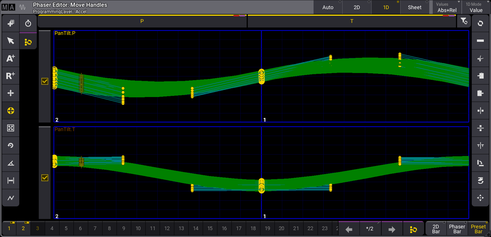 The smaller blue grids on the right are 1D layouts. Each attribute with more than one step in the phaser is displayed in its own 1D layout. The bold, vertical, blue lines in the 1D layouts represent beats, based on the speed of the phaser. The example above shows pan and tilt attributes, each with two steps.