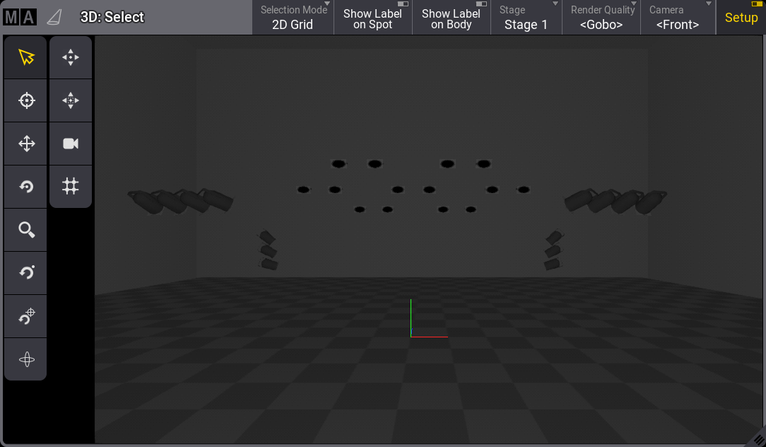 When the fixtures are patched, they are positioned at the zero position. This is where we see a green and red line in the image above. It is on the floor in the middle of the stage area as a default.