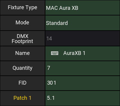 7 fixtures beginning from FID "301", name "AuraXB 1", and in Universe 5 beginning with address 1.