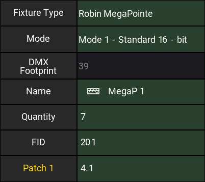Again, we need 7 fixtures. They should be in Universe 4 from address 1. The name for the first fixture should be "MegaP 1". The FID begins at "201".