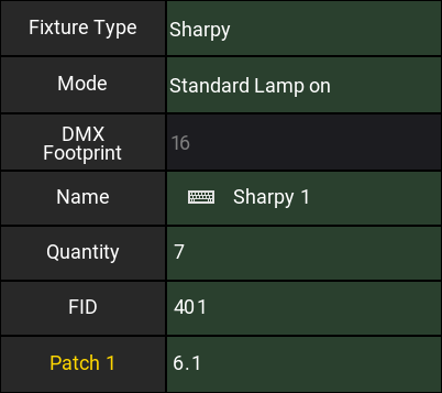 Again 7 fixtures from FID "401", name "Sharpy 1" in mode "Standard Lamp on", and starting at DMX address "6.1"
