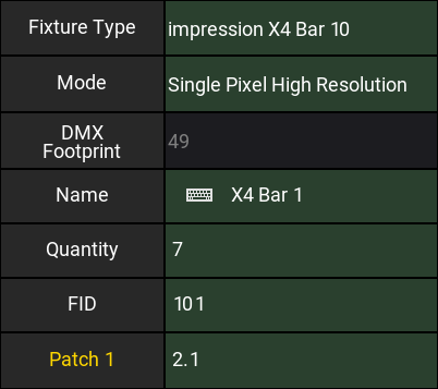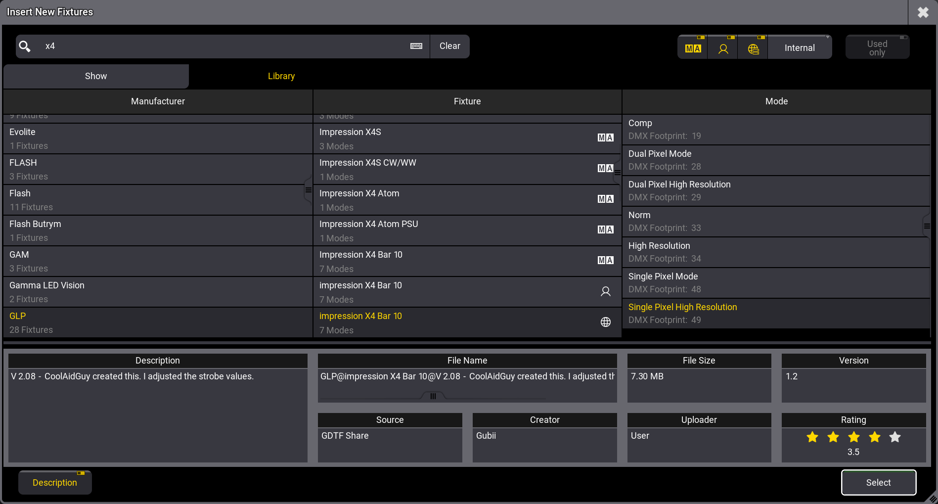 We want to import an "Impression X4 Bar 10" fixture from GLP in a "Single Pixel High Resolution" mode.
