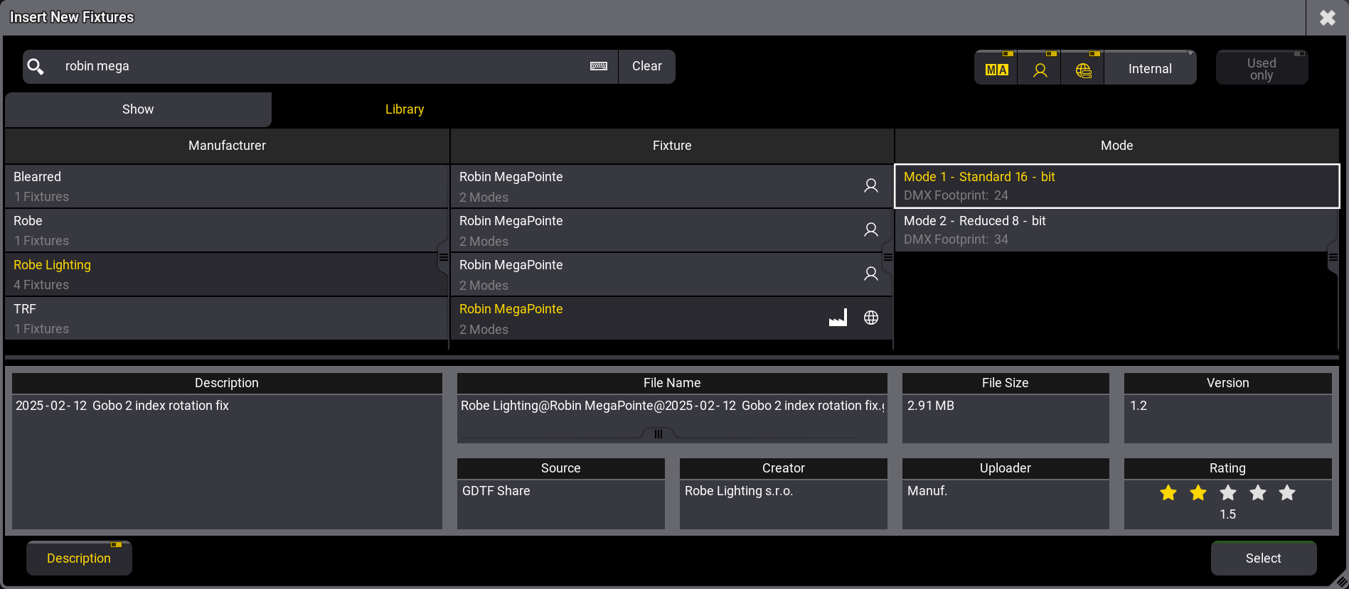 The next fixture type we need is the "Robin MegaPointe" from Robe Lighting using "Mode 1". Again, from the GDTF Share.