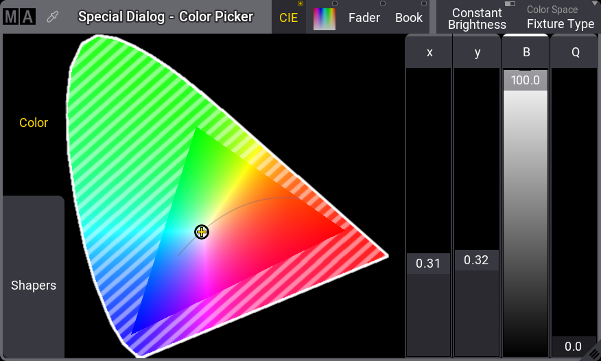 The left side of the window has two vertical tabs called "Color" and "Shapers". Shapers are used with fixtures that have motorized beam shaper functions. None of our fixtures have this, so we are just going to look at the color tab.