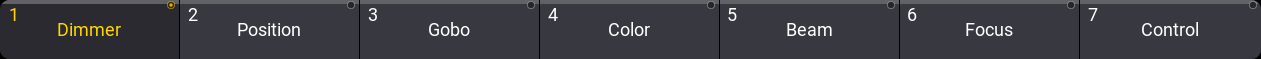 If you select fixture 101 (or group 6), the bar above each button might change (from gray to red). This indicates the feature groups you can use for the selected fixture. If you clear your programmer and try to select fixture 1, you can see that only the 'Dimmer' button got a red bar.