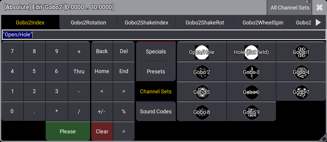 This gives access to the defined channel sets by a dynamic pool that changes content based on the selected feature ("Gobo" is the feature in the example above).