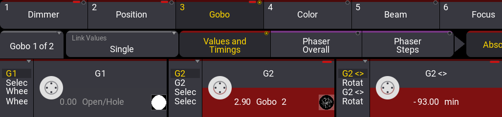 Now we have the gobo controls on the encoders. The first encoder is "G1" - this is gobo wheel one.