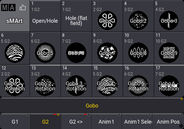 Now, the right side displays the defined gobos on the second wheel.