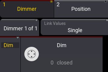 The image below shows the dimmer feature group selected. Below the feature group is a button showing the feature (the button says "Dimmer 1 of 1"). Below the feature, the first encoder controls the first attribute (Dim) in the dimmer feature.
