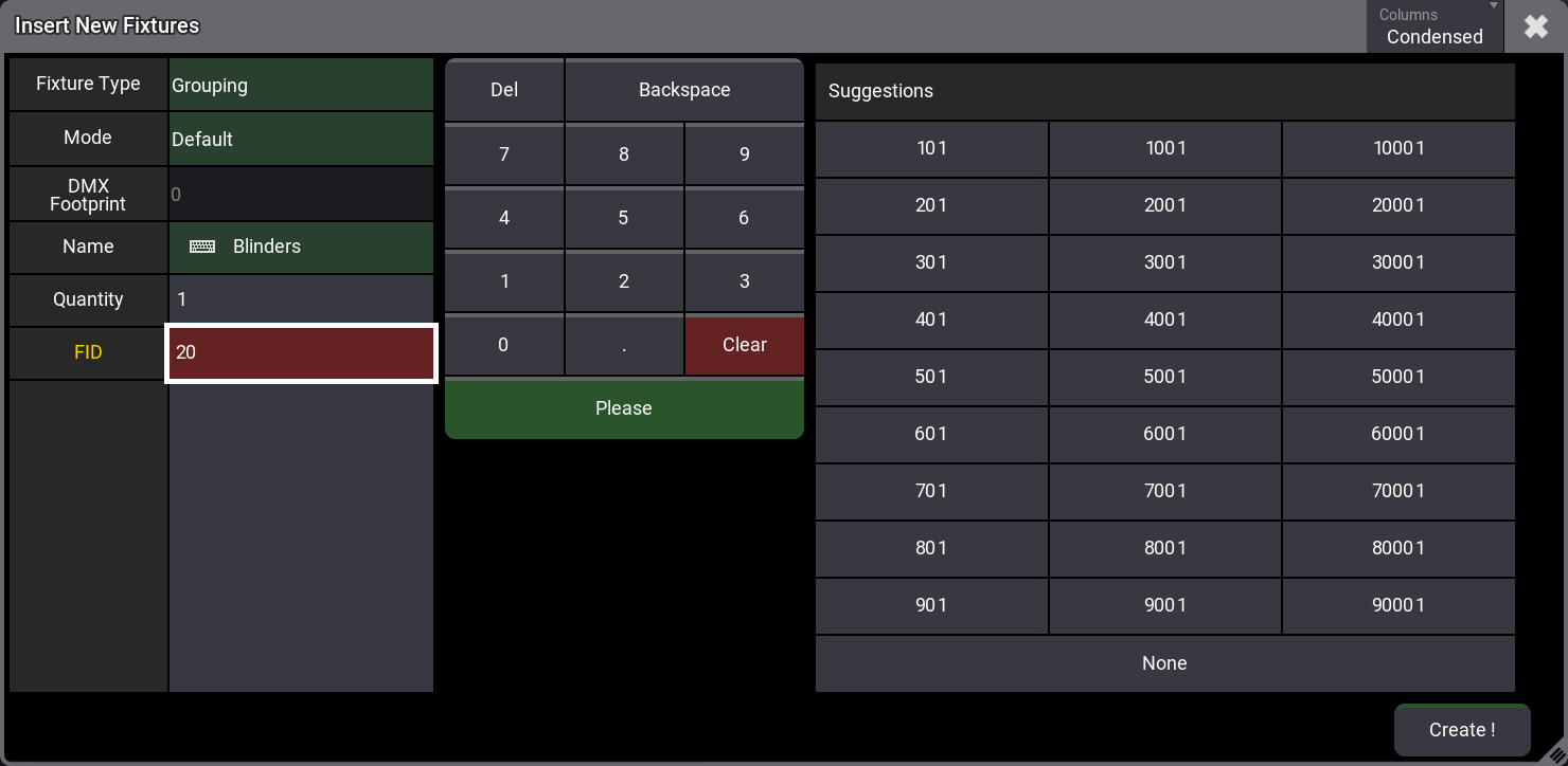 Name the fixture Blinders. We only need 1, but we want it to have FID 20 - type 20 in the FID input. This gives us a red background in the FID input to show us that there is a problem: