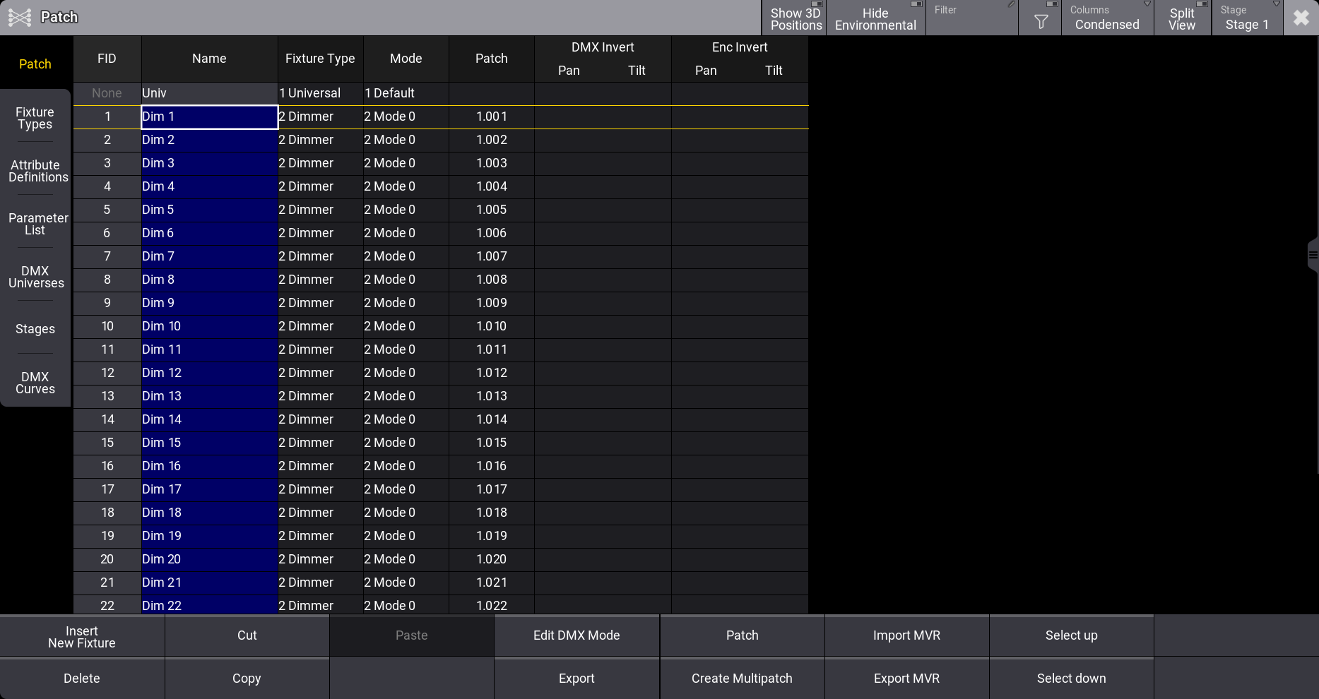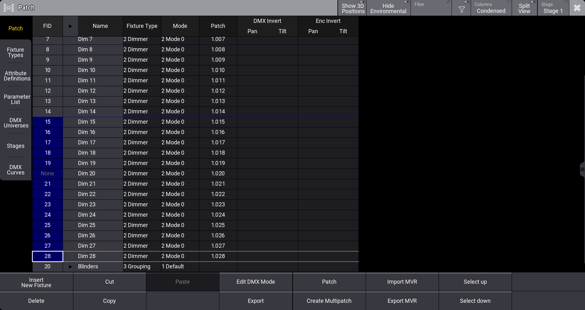 Now we have 28 dimmers named "Dim" followed by a number. They are patched to DMX address 1 in DMX universe 1 and upwards.