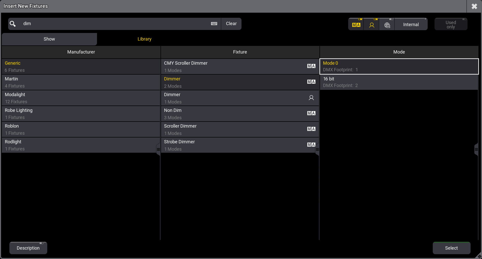 Now, the list is limited to only showing fixtures that have dim somewhere in the manufacturer name, the fixture name, or the fixture mode.