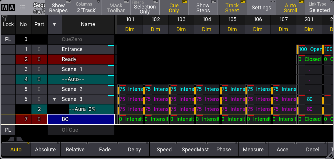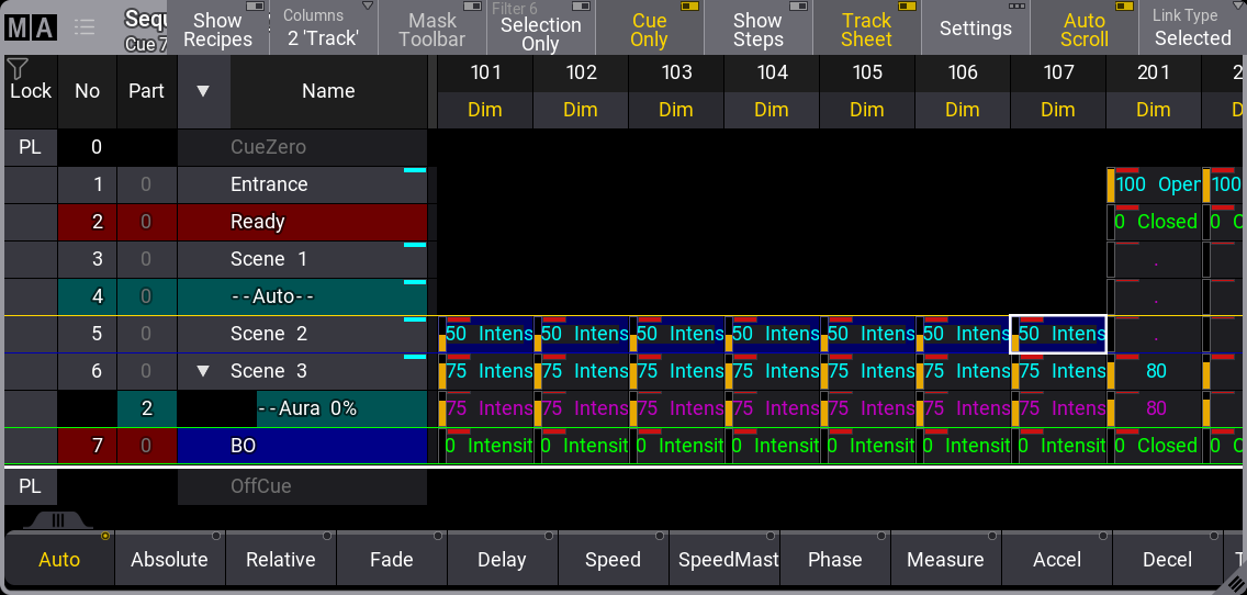 We can see what is stored in the cues by changing the sequence sheet into a tracking sheet.