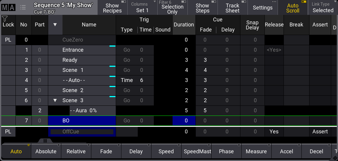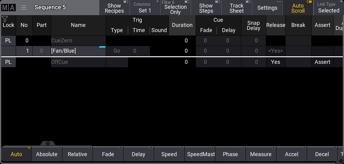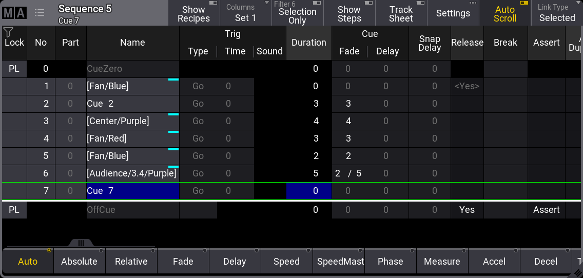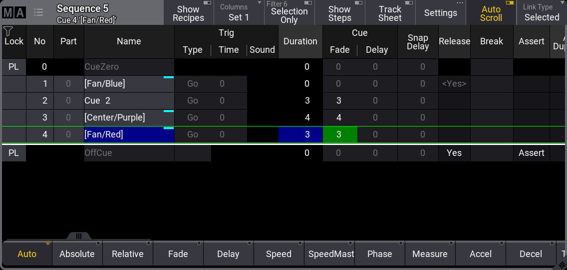 We also specified two different numbers separated by a forward slash. This means that the cue now has fade and outfade times. The outfade time (5 seconds) will be used by the dimmer going down in value (the Auras). All other attributes change values using the normal fade time (2 seconds).