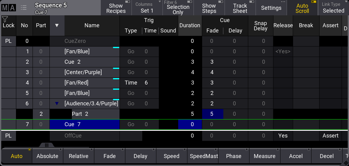 With cue 6, we created a cue where the Mega Pointes turn On, and the Auras turn Off. We know this because we just did it. If we return to this show after some time has passed, we might not remember that it is the Auras that use the outfade time. So, let us change this to a different solution that makes what is happening more obvious. We are going to create a part cue with the Auras.