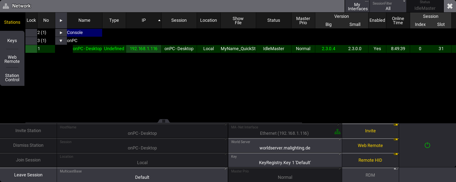 Then, a Session needs to be set up. There is always a master device in a session - this needs to be what we call a station. A Station is any grandMA3 device that can create and run a session. Other grandMA3 hardware in the network can join the session.
