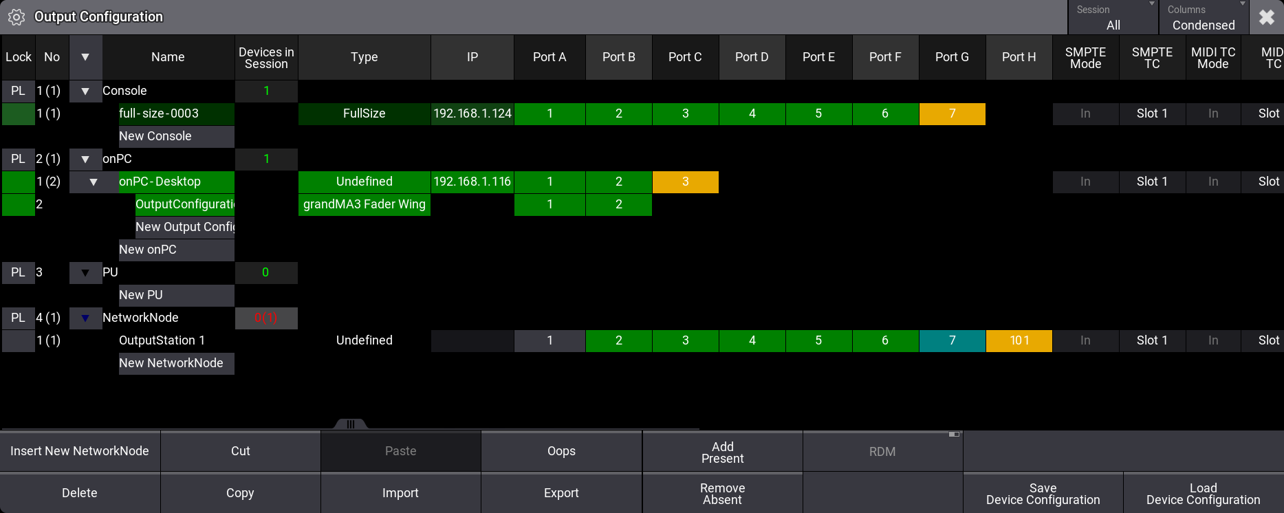 In the example image above, you can see a full-size console with DMX ports. The onPC has ports that match a grandMA3 onPC command wing and a connected grandMA3 onPC fader wing. Up to two grandMA3 onPC fader wings can be connected to each grandMA3 onPC station. Their ports appear as children of the onPC station.