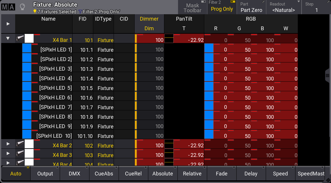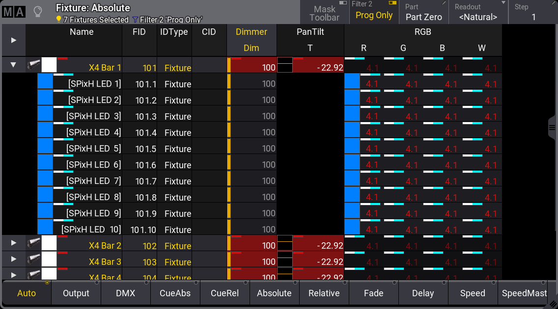Notice that we have selected the "main" part of the X4 fixtures. The dimmer and tilt are part of this main part. The main part does not have any color attributes. The values shown for the row with the main part are slightly dimmed. This indicates that the value shown is actually from the child or sub-fixture. The color attributes are actually in the sub-fixtures. We do not need to select the sub-fixtures explicitly to apply the color. Since the main fixture does not have this attribute, it is passed on to the sub-fixtures when applied to the main fixture. Have a look at the dimmer attribute. The main fixture and sub-fixtures all have dimmer attributes. The value is only applied to the selected (main) fixture. The sub-fixtures' default dimmer value is at 100%, so the result is a colored light output.