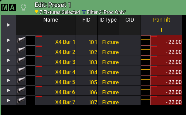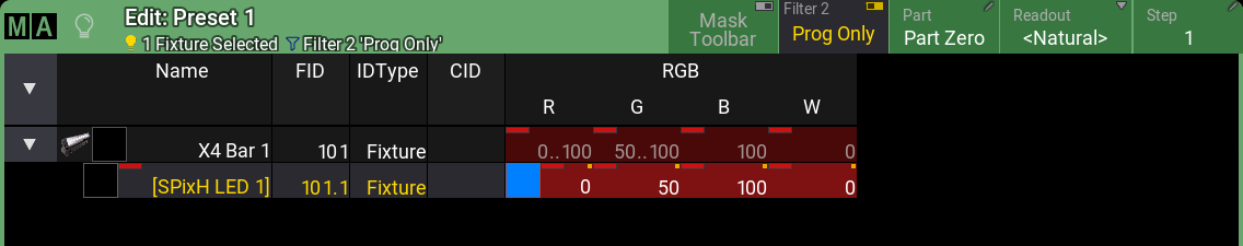 Now, we have called the preset reference into our programmer for the selected fixtures. This would also happen if we had used a group or manual selection to select some of the sub-fixtures.