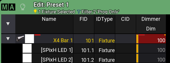 We see here that the value is only stored for the first sub-fixture of the first X4 fixture, and there is a small square yellow color indicator above each value.