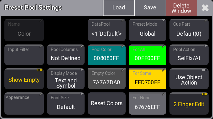 Each preset pool title field also has one of the mode letters showing the mode for the entire pool. This can be changed by clicking the MA logo in the title field for the pool. This opens the pool settings.