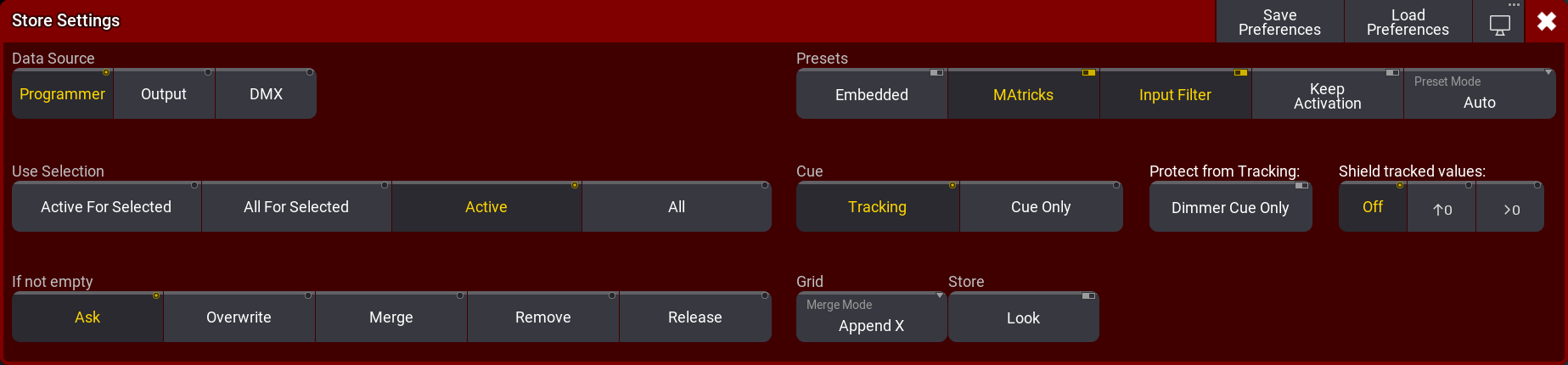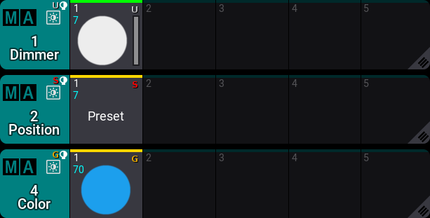 The position preset got a small red "S". This tells us it is a Selective preset. Selective presets only contain values that can be used by the fixtures that had the values when the preset was stored.