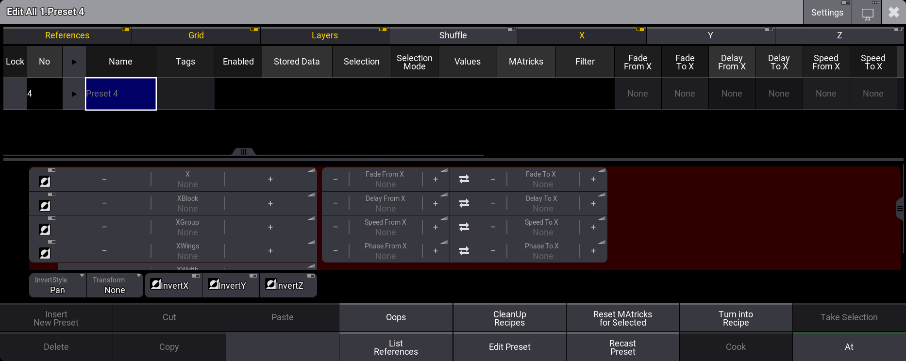 We will now create a recipe preset that does not contain a selection. A preset without a selection can be applied to the current selection. The valid values are then cooked into the programmer.
