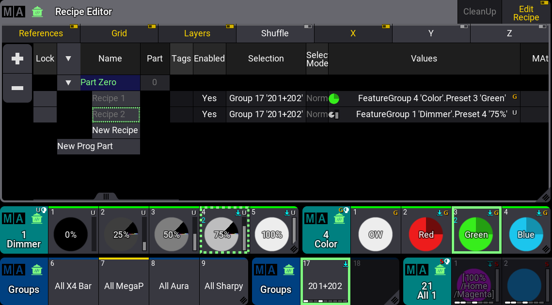 The second cues recipe line should have our recipe group (Group 17) as the selection and the All preset as the "values".
