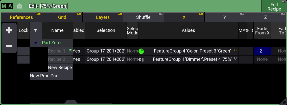 The Recipe Editor is a window we can use to build and edit a recipe in the programmer. We will use this to create a new recipe and store it in a new preset.